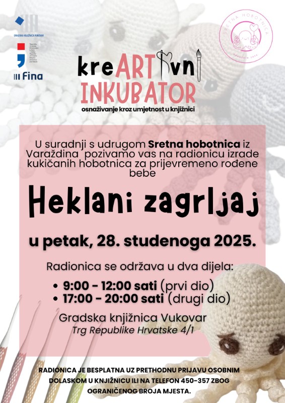 Gradska knjižnica Vukovar u saradnji s udruženjem "Sretna hobotnica" iz Varaždina poziva na radionicu izrade heklanih hobotnica za prevremeno rođene...