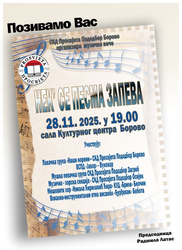 Srpsko kulturno društvo "Prosvjeta" pododbor Borovo organizuje muzičko veče "Nek' se pesma zapeva", koje će biti održano u petak, 28....