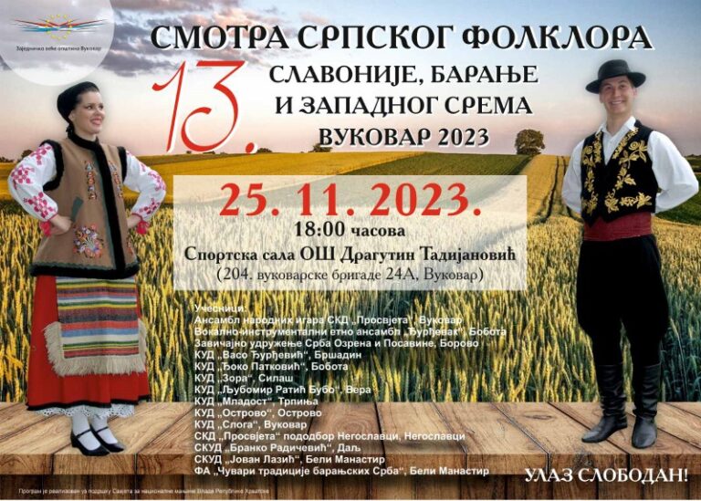 Trinaesta smotra srpskog folklora Slavonije, Baranje i zapadnog Srema - Vukovar 2023., u organizaciji Zajedničkog veća opština biće održana u...