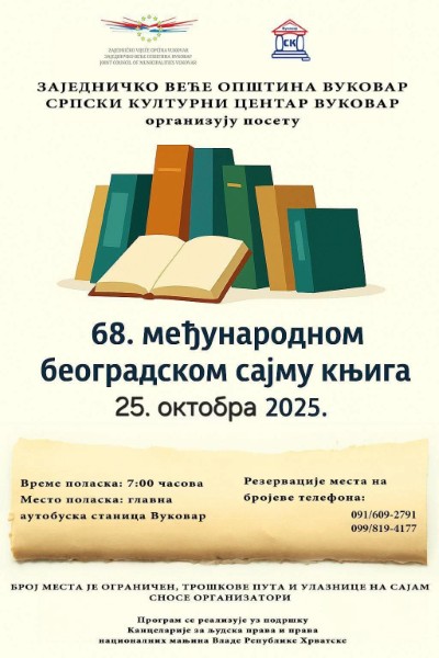 U organizaciji Zajedničkog veća opština Vukovar i Srpskog kulturnog centra Vukovar 25. oktobra biće organizovana poseta 68. međunarodnom beogradskom sajmu knjiga.