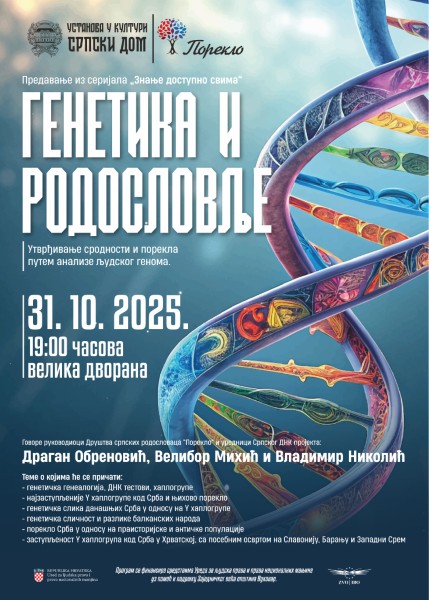 Ustanova u kulturi Srpski dom u Vukovaru organizuje predavanje i tribinu “Genetika i rodoslovlje” u okviru programa “Znanje dostupno svima”.