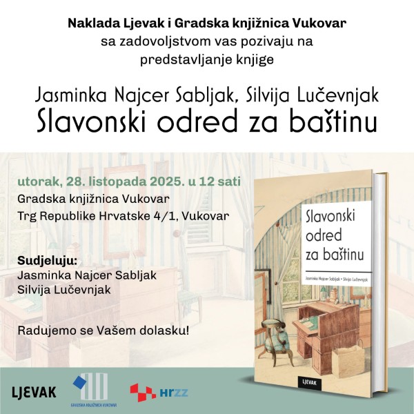 U okviru Meseca hrvatske knjige, Izdavačka kuća Ljevak i Gradska knjižnica Vukovar pozivaju na predstavljanje knjige “Slavonski odred za baštinu”, autorki Jasminke Najcer Sabljak i Silvije Lučevnjak.