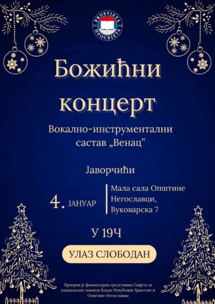U organizaciji negoslavačkog pododbora Srpskog kulturnog društva "Prosvjeta" u Negoslavcima će biti održan Božićni koncert u kome će nastupiti članovi...