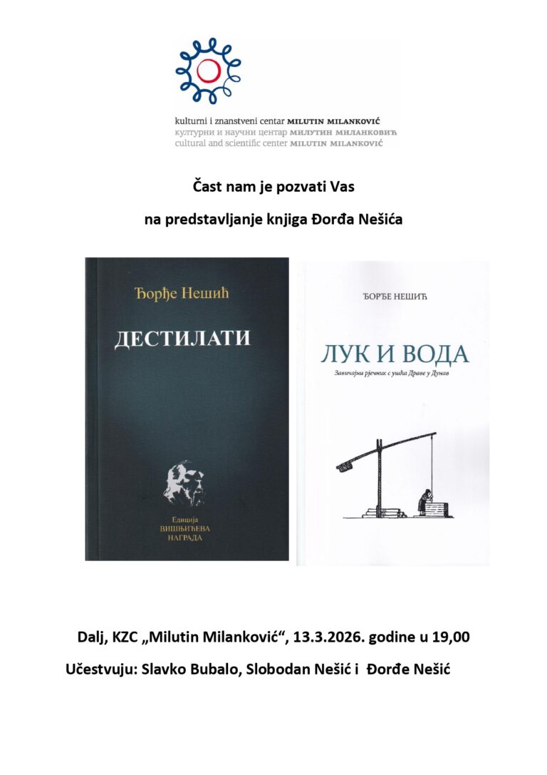 U Kulturnom i naučnom centru "Milutin Milanković" u Dalju sinoć su predstavljene dve knjige Đorđa Nešića, zbirka izabranih pesama "Destilati"...