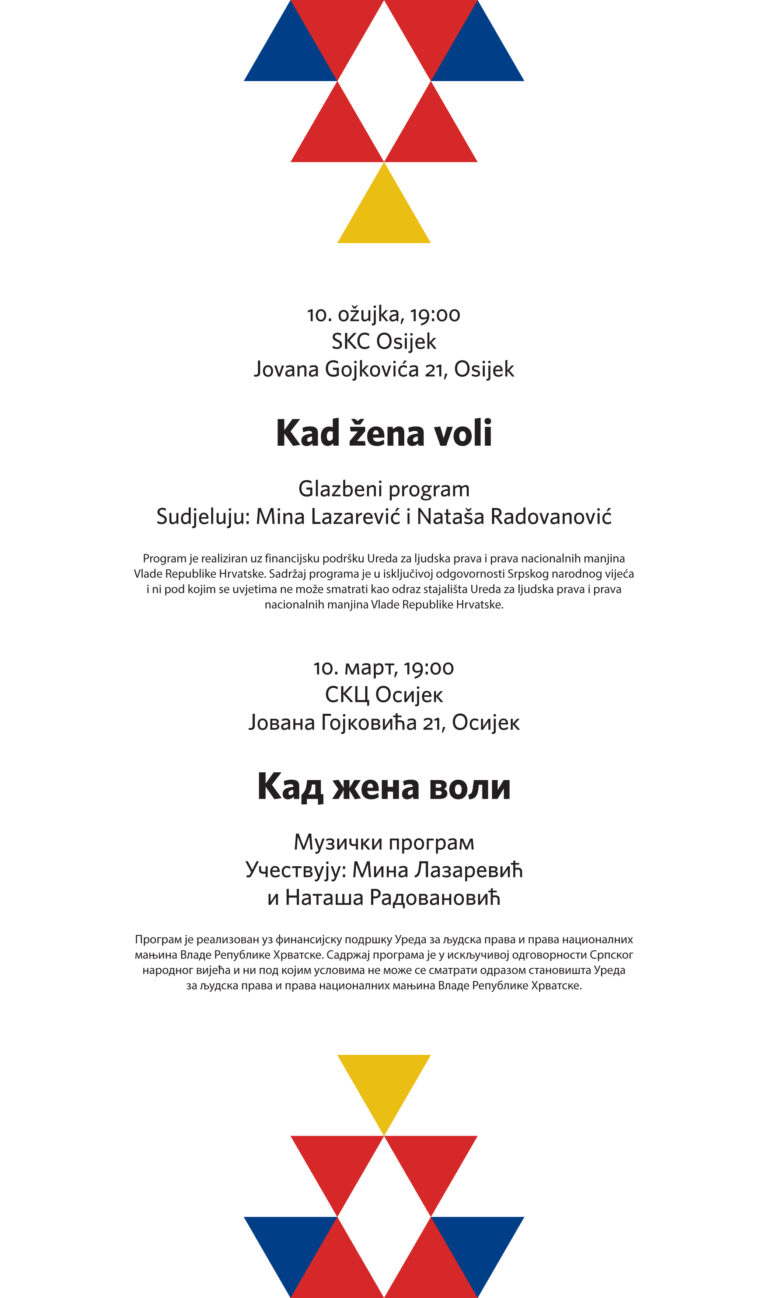 Iz Srpskog kulturnog centra u Osijeku pozivaju na muzički program "Kad žena voli", koji će biti održan u utorak, 10....