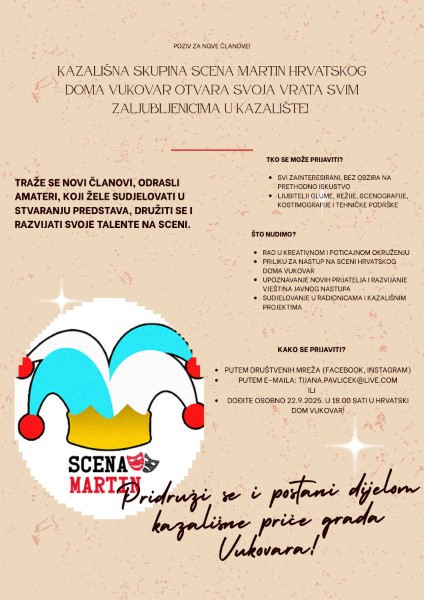 Pozorišna grupa "Scena Martin" Hrvatskog doma Vukovar poziva nove članove da im se pridruže. Traže nove odrasle amatere koji žele...
