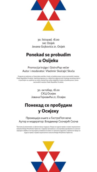 Srpski kulturni centar Osijek organizuje program "Ponekad se probudim u Osijeku", to jest promociju knjige poezije Vladimira Skočajića Skoče pod...