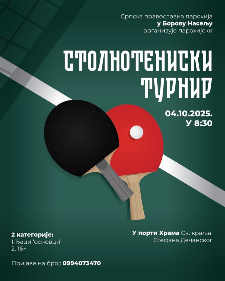 Srpska pravoslavna parohija u Borovu naselju organizuje parohijski Stonoteniski turnir, koji će biti održan 4. oktobra s početkom u 8...