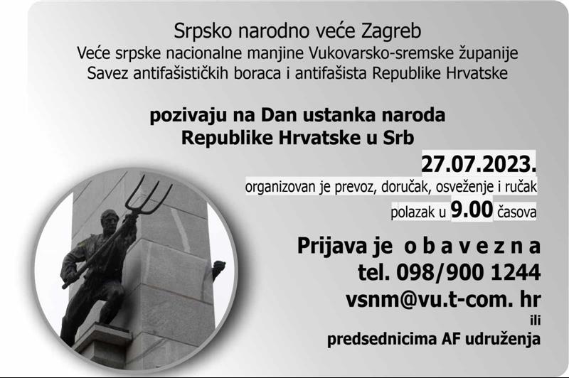 Srpsko narodno veće Zagreb, Veće srpske nacionalne manjine Vukovarsko-sremske županije i Savez antifaštističkih boraca i antifašista Republike Hrvatske 27. jula pozivaju na Dan ustanka naroda Republike Hrvatske u Srb.