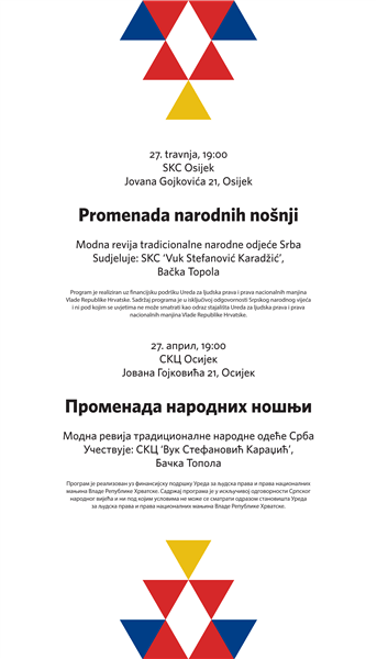 – Nešto drugačija modna revija vratiće nas u prošlost, da bi nas podsetila na način odevanja od pre jednog i više vekova. Članovi Srpskog kulturnog centra „Vuk Stefanović Karadžić“ iz Bačke Topole predstaviće narodne nošnje Srba iz raznih krajeva koje je, tokom prošlosti, naseljavao srpski narod. Revijalni događaj osmišljen je kao živa korelacija s „Narodnim nošnjama Srba”, izložbom koja ovih dana krasi prostor Srpskog kulturnog centra u Osijeku – navode u pozivu organizatori.