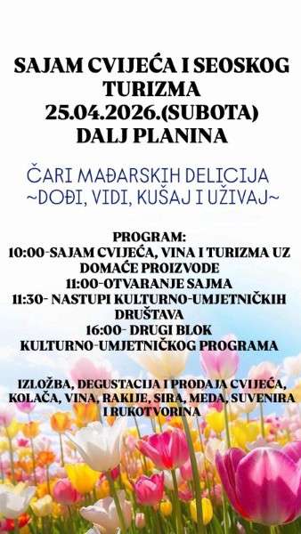 Iz Turističke zajednice Opštine Erdut pozivaju na još jedan Sajam cveća i seoskog turizma koji će biti održan 25. aprila u Dalj Planini, s posebnim naglaskom na gastronomsku baštinu mađarskih sugrađana pod geslom: “Čari mađarskih delicija – Dođi, vidi, kušaj i uživaj!”