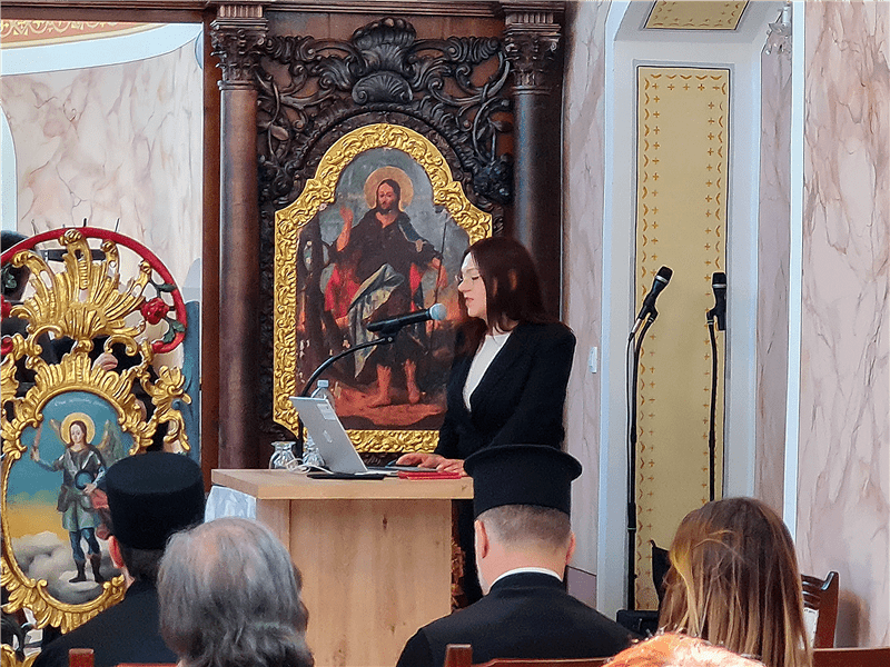 Kroz kratki osvrt na istoriju ikonostasa predstavila je istraživanja, koja su provedena na izvornim delovima ikonostasa i predlog radova koji je napravljen na temelju tih istraživanja. Nakon toga je detaljnije objasnila i pokazala dosad izvedene konzervatorsko-restauratorske radove na središnjim i bočnim vratima ikonostasa, koja su nedavno montirana na svoje izvorne pozicije.