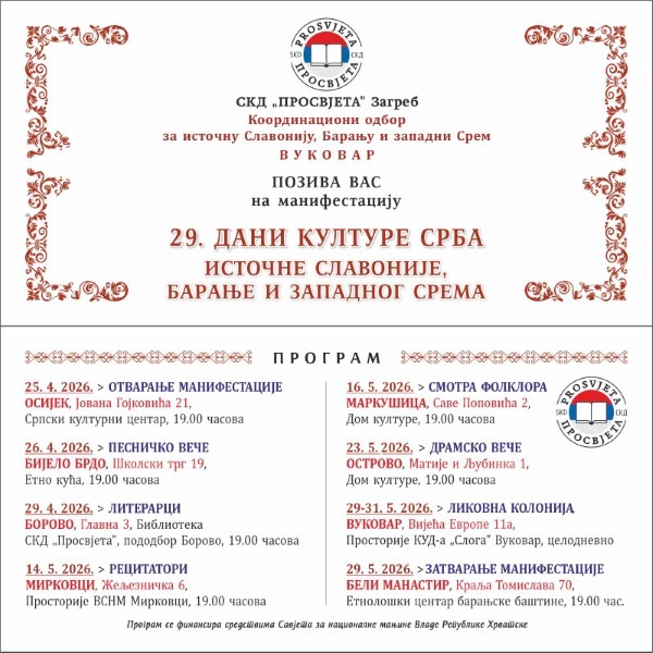 Ovogodišnji 29. dani kulture Srba istočne Slavonije, Baranje i zapadnog Srema Srpskog kulturnog društva “Prosvjeta” biće održani od 25. aprila do 29. maja, a imaće osam programskih dana.