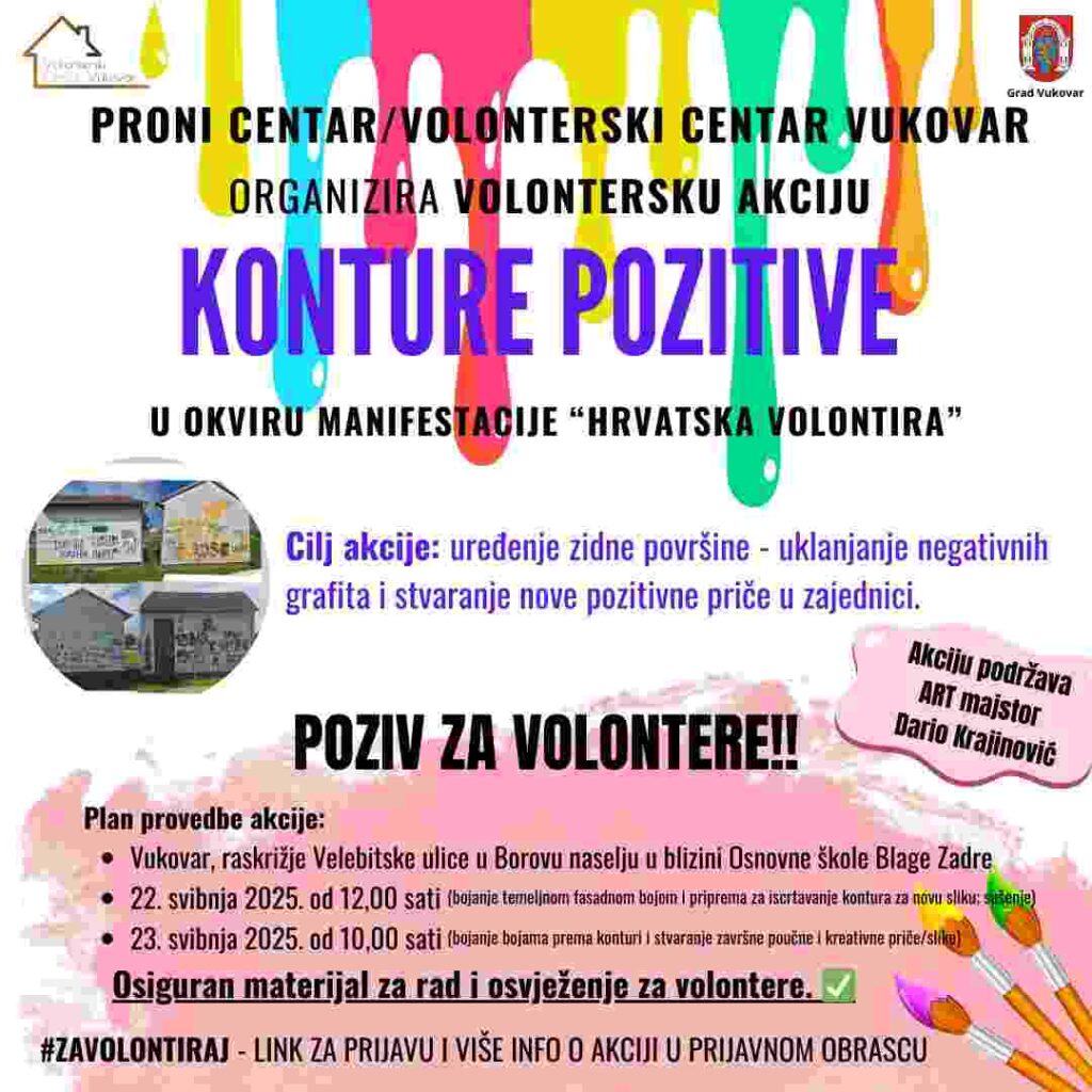 Volonterski centar vukovarskog PRONI centra poziva na volontersku akciju “Konture pozitive” u okviru manifestacije “Hrvatska volontira”. Cilj akcije je uređenje zidne površine odnosno uklanjanje negativnih grafita i stvaranje nove pozitivne priče u zajednici. Akciju podržava art majstor Davor Krajinović.